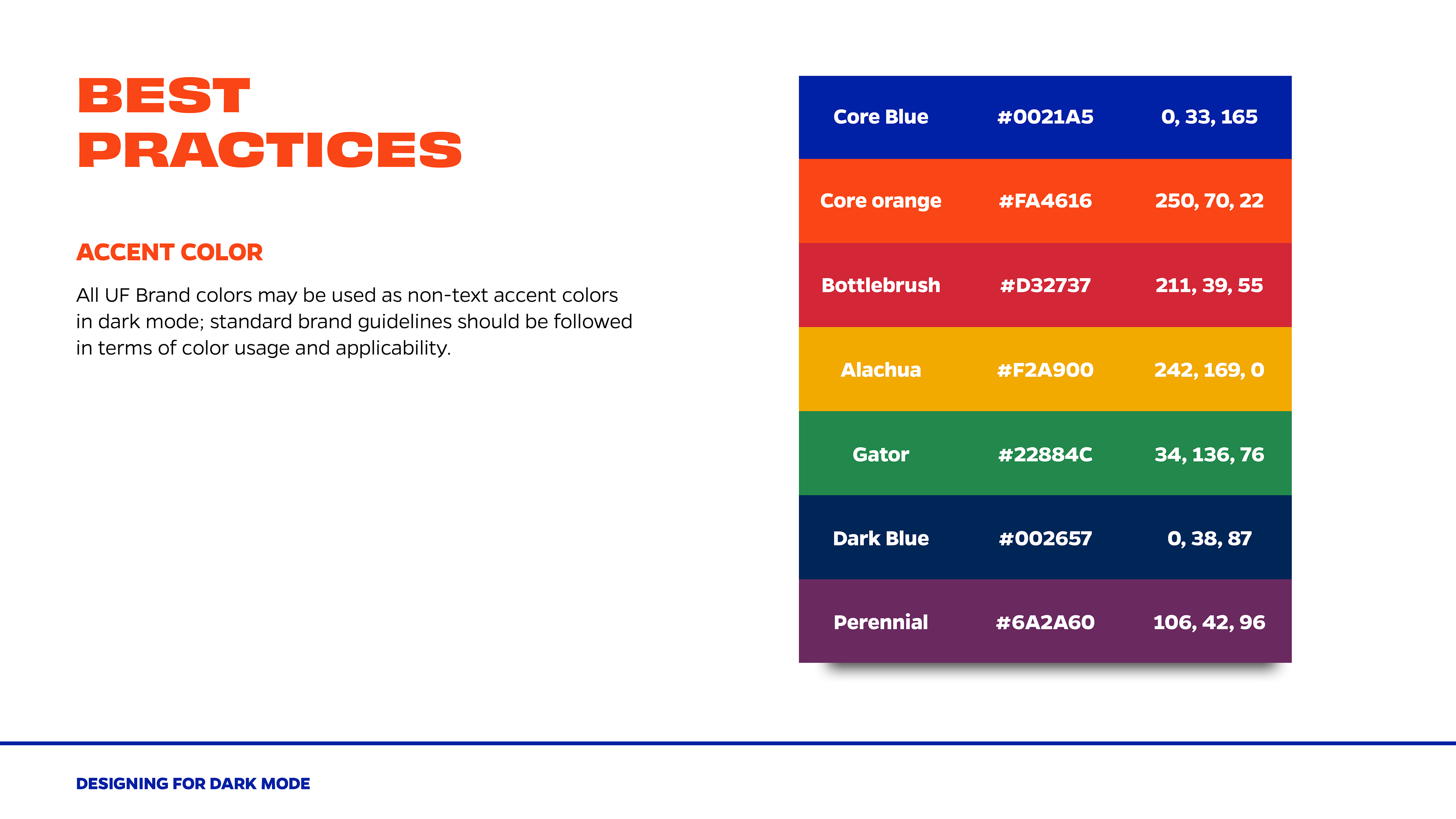 To promote accessibility and consistency within the University of Florida brand across digital platforms, I developed a comprehensive presentation that outlines best practices for designing in dark mode. This presentation begins by defining dark mode and outlining its applications, then transitions into practical solutions and best practices for integrating the UF brand. As part of the design and research process, I conducted a series of accessibility tests on the UF brand colors and established guidance for how these colors should be used as text, accent colors, and background colors. As a final addition, I created a mockup of the Print Standards page from the UF Brand Center in Adobe XD to demonstrate how dark mode can be implemented in existing resources. This mockup can be accessed using the link below.