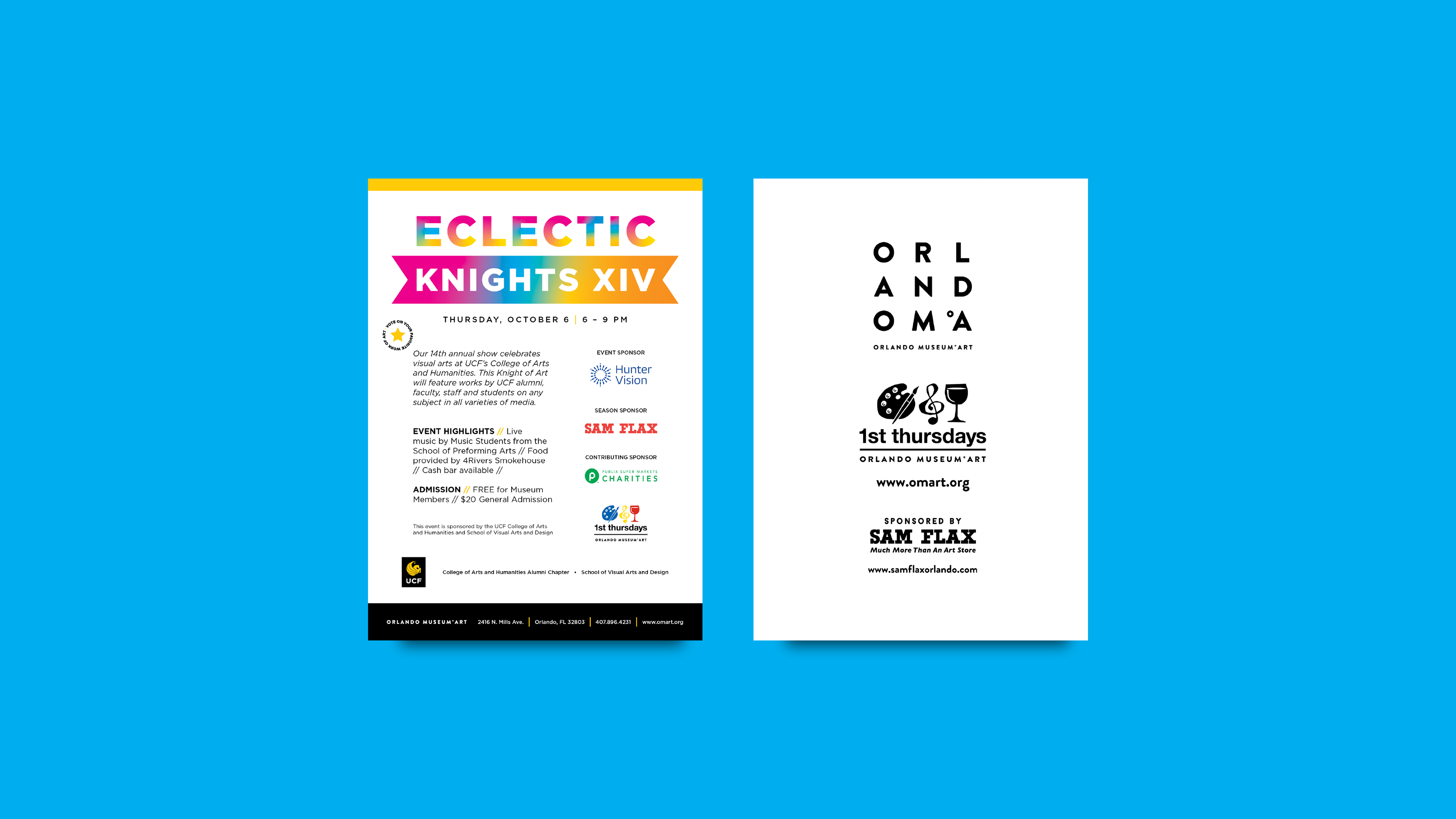 Eclectic Knights is hosted annually by the Orlando Museum of Art and sponsored by the UCF College of Arts and Humanities (CAH) and School of Visual Arts and Design (SVAD); this event is open to the public and celebrates the visual arts by showcasing work by UCF alumni, faculty, staff, and students. In summer 2022, I had the pleasure of developing a unique identity system and flyer to market Eclectic Knights XIV. I chose to incorporate elements of the UCF brand while utilizing an eye-catching and flexible gradient of colors to add distinction.